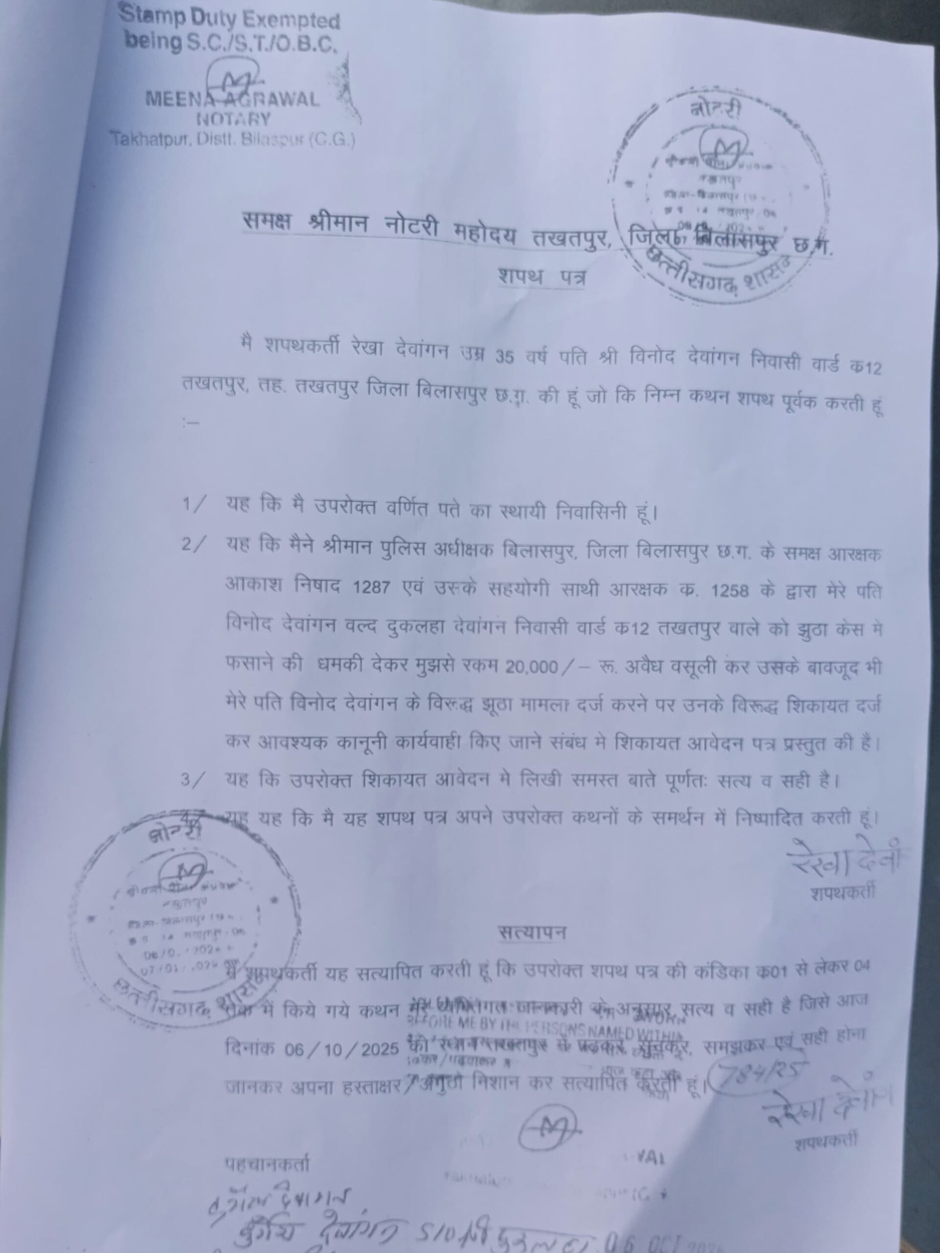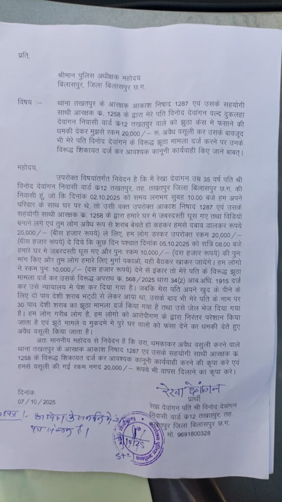 प्राप्त जानकारी के अनुसार तखतपुर वार्ड क्रमांक 12 निवासी एक महिला ने तखतपुर थाने में लंबे समय से पदस्थ एक आरक्षक पर जबरन घर में घुसने ,पैसे वसूली करने और नहीं देने पर महिला के पति को पकड़कर जबरदस्ती अवैध शराब बेचने का मामला बनाकर जेल भेजने का आरोप लगाया है।उसने पुलिस अधीक्षक के नाम लिखे आवेदन में बताया है कि तखतपुर थाने में पदस्थ आरक्षक क्रमांक 1287आकाश निषाद अपने एक साथी आरक्षक के साथ 2 अक्टूबर की सुबह 10 बजे जबरदस्ती घर में घूस गया और वीडियो बनाने लगा। साथ ही तुम लोग शराब बेचते हो कह कर धमकाते हुए 20 हजार रुपए की मांग की और झूठे मामले में फंसा कर जेल भेजने की धमकी दे रहा था। हमने डरकर उसे 20 हजार रुपए दे दिए। 5 अक्टूबर को वह फिर घर में घूस आया और फिर से 10 हजार की मांग करने लगा साथ ही मुर्गा बनाने और हमर ही घर में खाने की बात कहने लगा ।उसको हमने पैसे देने से मना कर दिया। तो अगले ही दिन उसने मेरे पति को शराब भट्ठी से अपने पीने के लिए 4 पाव शराब लाते हुए पकड़ लिया और उसके विरुद्ध 30 पाव शराब लाने का झूठा मामला दर्ज कर न्यायालय में पेश कर जेल भेज दिया है। हम लोग गरीब है और आकाश निषाद और उसके सहयोगी आरक्षक द्वारा आए दिन घर में आकर झूठे मामले में फंसाकर जेल भेज देने की धमकी देकर पैसे की मांग की जाती थी।उनको पैसे नहीं दिए तो मेरे पति को झूठे मामले में फंसाकर जेल भेज दिया है। पुलिस अधीक्षक से शिकायत करते हुए महिला ने आरक्षक आकाश निषाद और उसके साथी के विरुद्ध जांच कर उचित कार्यवाही की मांग की है।अपनी शिकायत के साथ शिकायतकर्ती ने एक शपथ पत्र भी दिया है,जिसमें उसने शिकायत को सत्य बताया है।सम्भवतः ऐसा पहली बार हुआ है कि किसी शिकायतकर्ता ने अपने शिकायत के साथ शपथ पत्र भी दिया है।