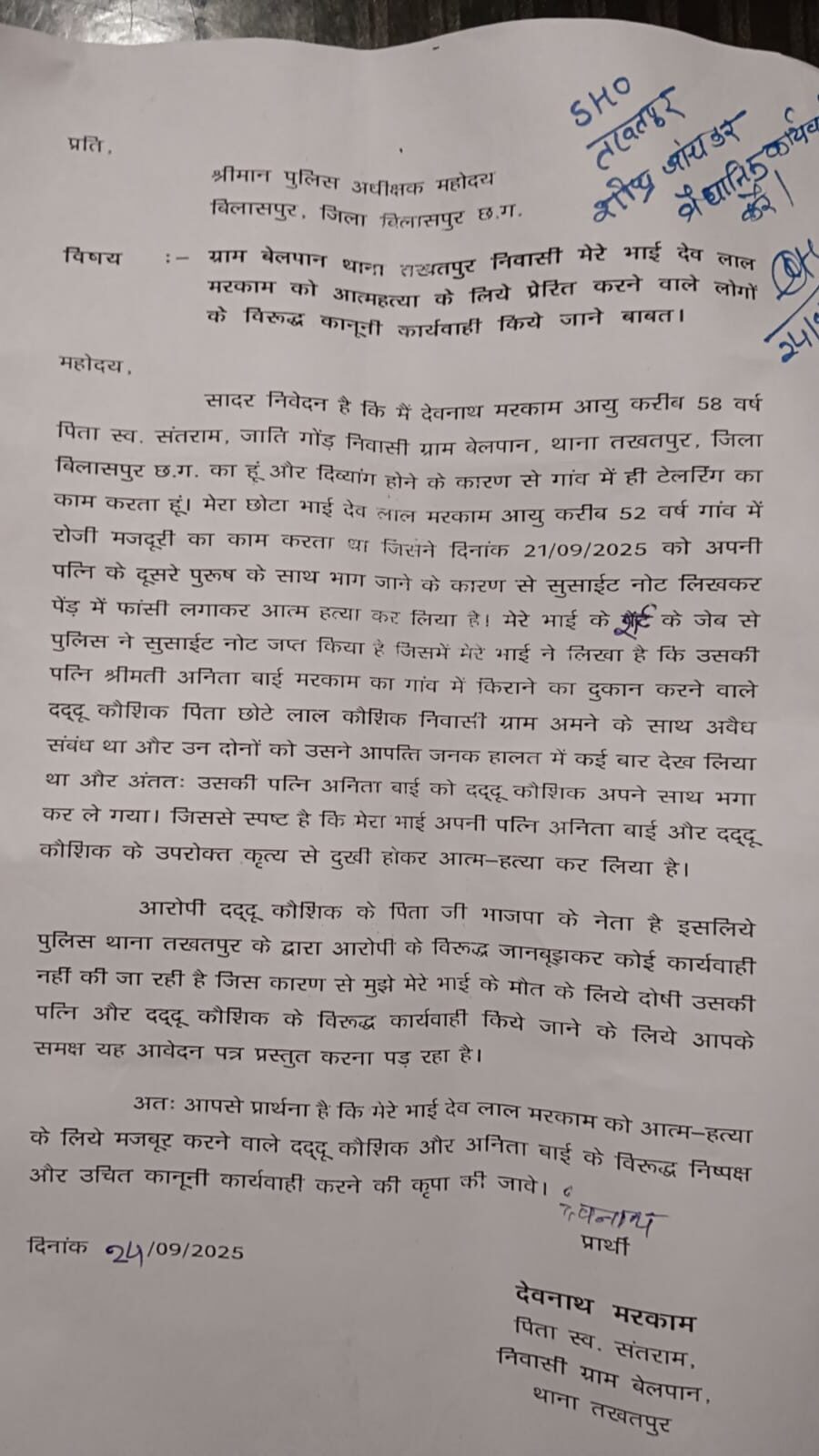तखतपुर के बेलपान में भाजपा के पूर्व मंडल अध्यक्ष छोटे लाल कौशिक के बेटे दद्दू कौशिक के विरुद्ध आत्महत्या के लिए प्रेरित करने के मामले में कार्यवाही नहीं किए जाने से नाराज परिजन शुक्रवार को पुलिस अधीक्षक कार्यालय पहुंच गए वह अतिरिक्त पुलिस अधीक्षक अर्चना झा से मुलाकात कर आरोपी के विरूद्ध कड़ी कार्यवाही किए जाने की मांग की है। तखतपुर के बेलपान में एक आदिवासी मजदूर देवलाल मरकाम ने भाजपा मंडल विजयपुर के पूर्व मंडल अध्यक्ष छोटे लाल कौशिक के पुत्र दद्दू कौशिक पर अपनी पत्नी को भगाकर ले जाने का आरोप लगाते हुए फांसी लगाकर आत्महत्या कर ली थी। मृतक की जेब से मिले सुसाइड नोट में मृतक ने बताया था कि छोटे लाल कौशिक का बेटा दद्दू कौशिक मेरी पत्नी को अपने साथ ले गया है।इससे मैं बहुत परेशान हूं मेरी मौत का कारण दद्दू कौशिक है।मेरे दोनों छोटे बच्चों की जवाबदारी भी अब उसी की होगी।
